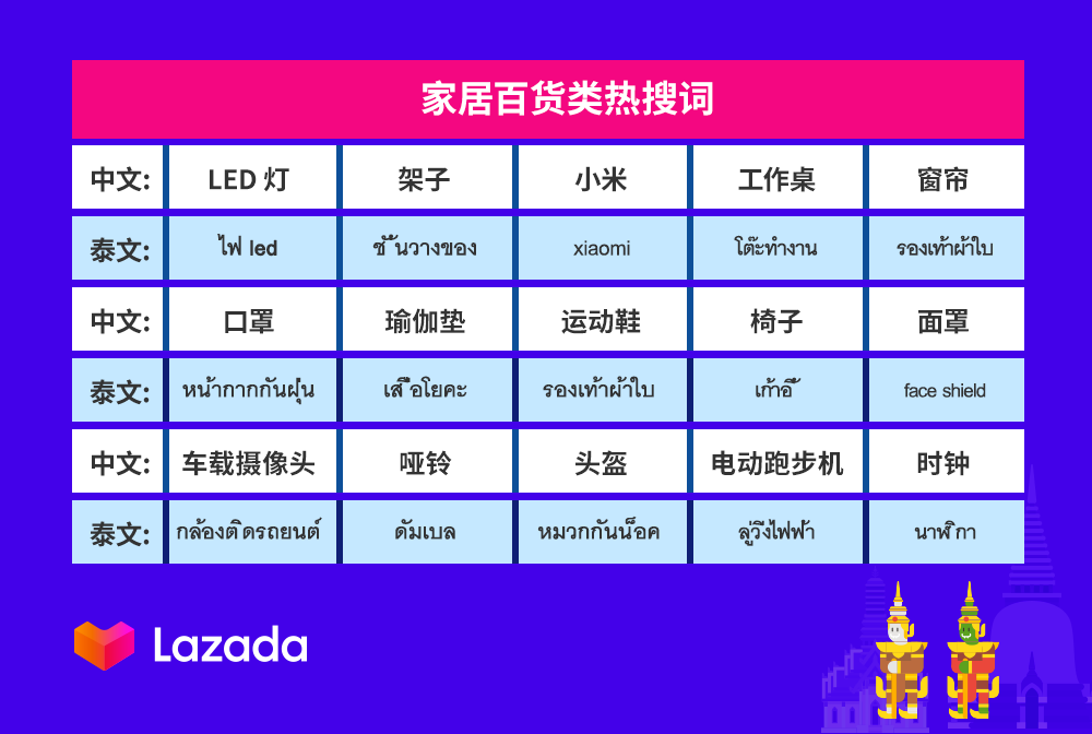 家居百货中运动鞋、窗帘、摩托车头盔等是消费者长期热搜产品,其次是当前泰国健身房等场所均不能开放,与在家健身相关的类目有很大机会,比如瑜伽垫、电动跑步机、哑铃、健身软球等。
