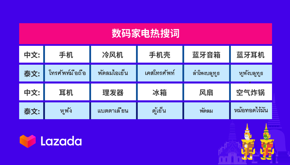 温馨提示:对于此类长期热搜词,可以把多种搜索习惯都加入商品标题之中,注意同一中文词可对应多种泰语搜索习惯。
