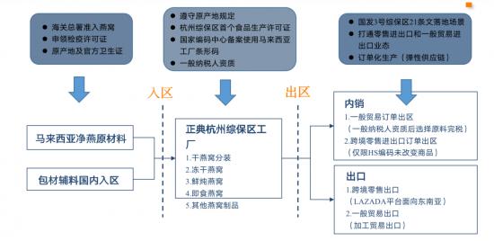 并且下沙园区也有了新的业务场景,以天猫国际进口燕窝为例,原料来自马来西亚的净燕原料,国内辅材入区,在综保区工厂形成了干燕窝分类、冻干燕窝、鲜炖燕窝、即食燕窝。出去之后销售有国内/国外两个市场,一般贸易订单出去企业办理一般纳税人资格之后选择原料完税,进行鲜炖燕窝直接寄到C端消费者手上。在编码没有改变的情况下做跨境零售订单,海外市场同时可以在LAZADA平台上面向东南亚市场;一般贸易出口是加工贸易出口。既有国内市场也有国外市场。