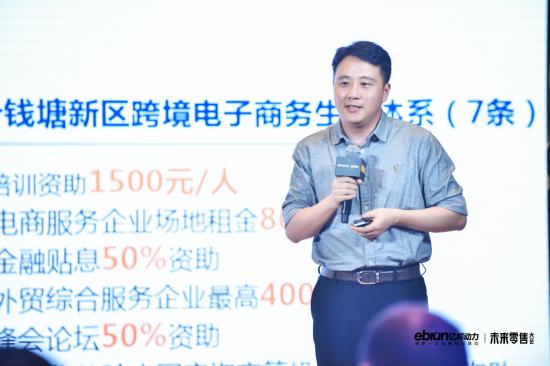 2020年10月16日下午,在亿邦动力主办举行的“2020亿邦未来零售大会·全球跨境电商私享会暨杭州跨境电商综试区政企恳谈会”上,钱塘新区综合保税区跨贸电商部负责人俞宙发表了“开放共赢 魅力钱塘”的推介演讲,他表示,希望通过跟企业的交流过程中不断了解企业在物流、金融、结售汇业务过程中不舒服的地方,帮助企业避免不确定性因素,更好地推动跨境电商企业发展。