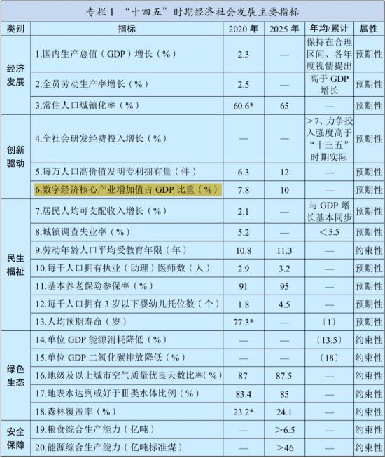 3、第一篇-第三章-第二节“十四五”时期经济社会发展主要目标中,“数字经济核心产业增加值占GDP比重”首次成为体现创新驱动的指标。