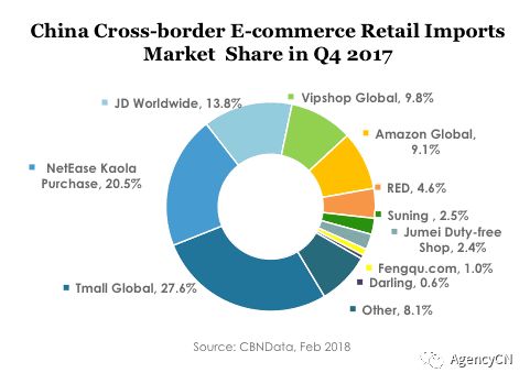 Currently,there are more than a dozen different Cross-Border e-commerce platforms in China covering every product category.In the last few years a great number of Platforms sprang up,such as Jumei Global Store,Daling,Amazon Global,B&G,Kaola.com,Suning Global,JD Worldwide and VIP International.However,the market is still dominated by the best known platform of the biggest domestic ecommerce player,Alibaba’s Tmall Global,which holds more than 27%.Luckily this trend has been changing since smaller platforms are increasing their presence in the e-market.